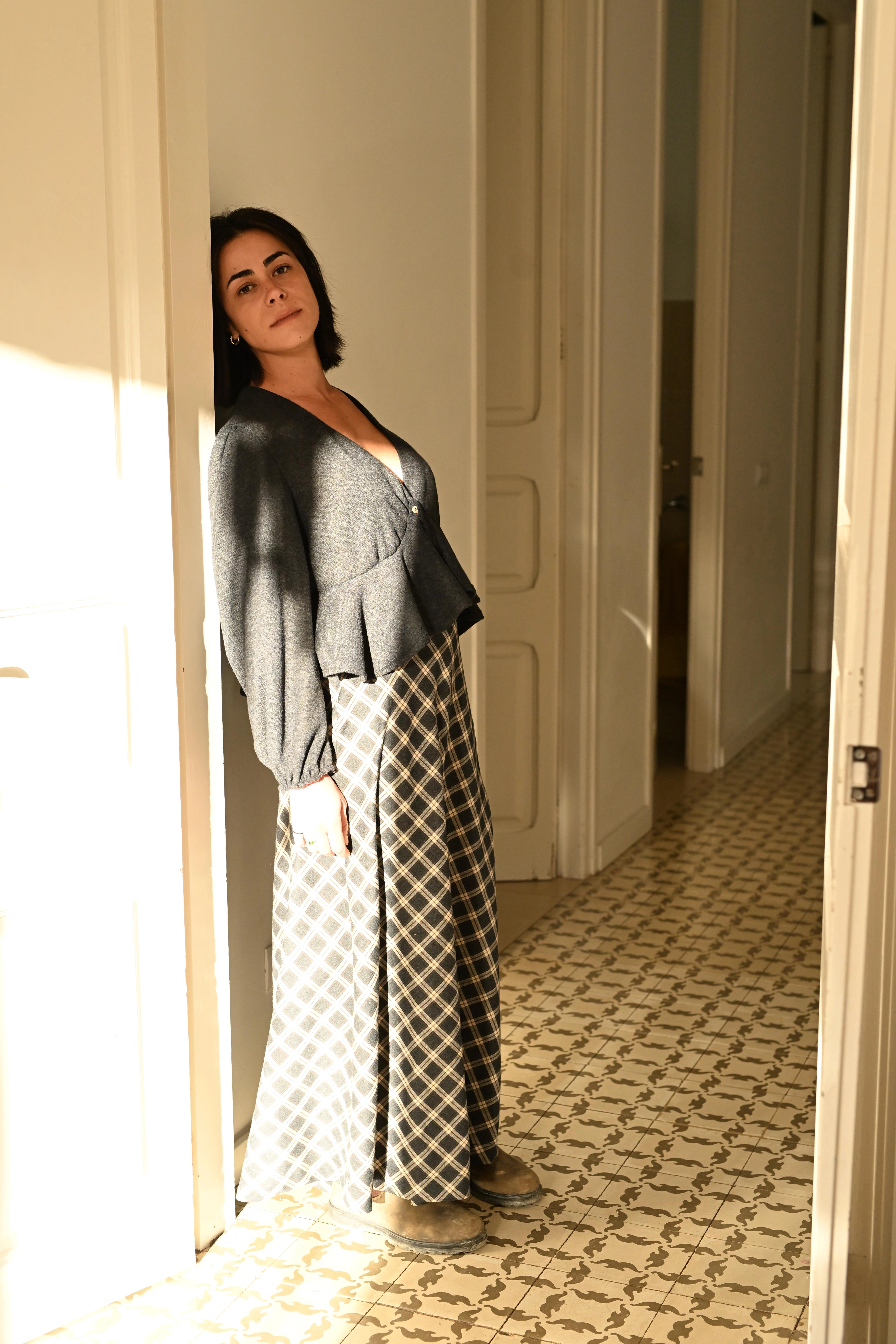 Blusa abullonada cuadros gris