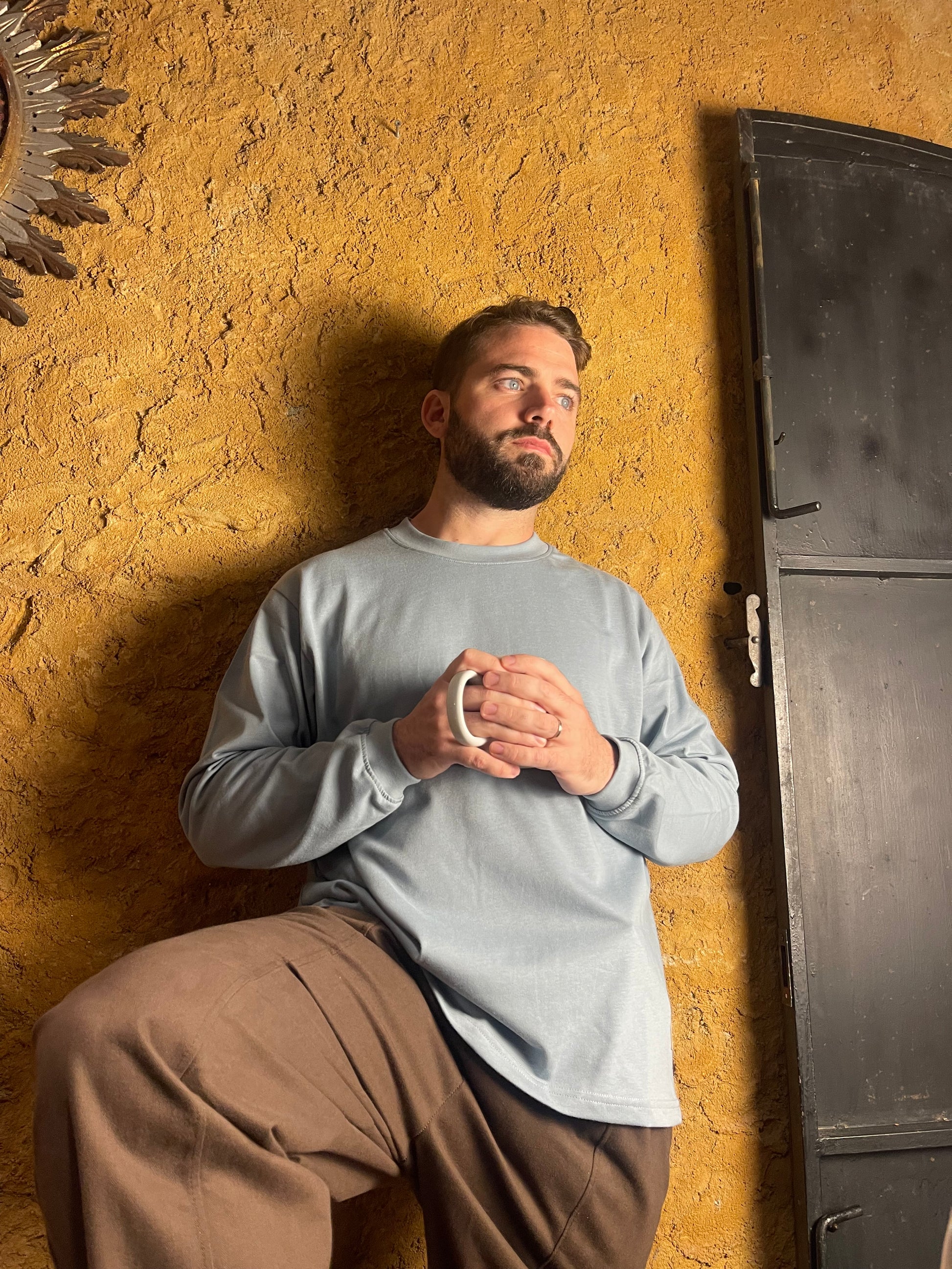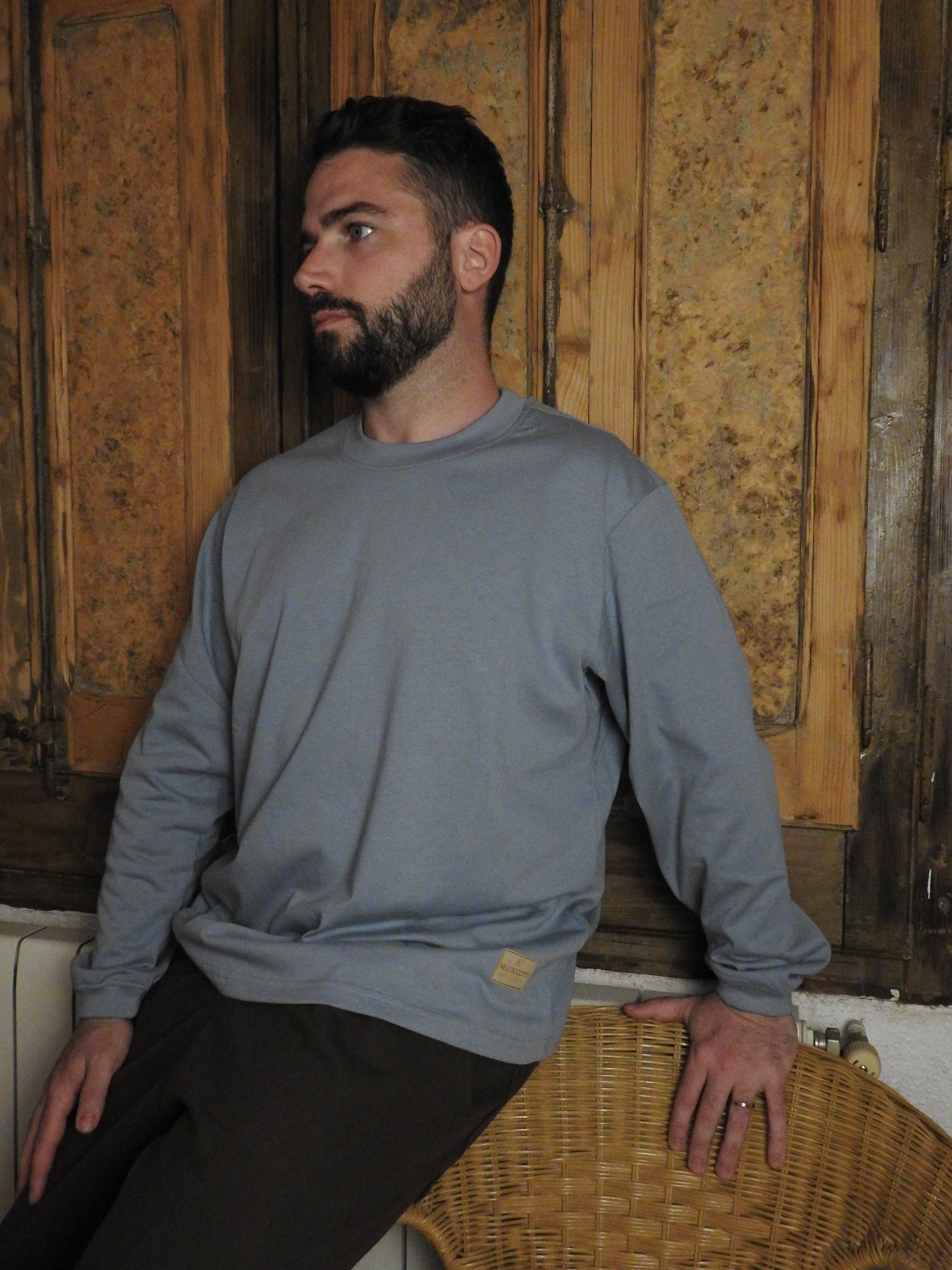 Cuello redondo, puños con remate ancho de canalé y hombros caídos. Ideal para combinar con cualquier look de la temporada y que sea tu primera capa orgánica y sostenible en los días más fríos.